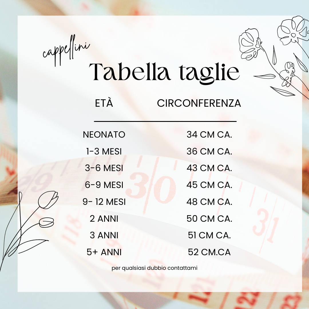 Le misure si riferiscono alla circonferenza della testolina misurata passando sulla fronte, sopra le orecchie e sulla nuca.